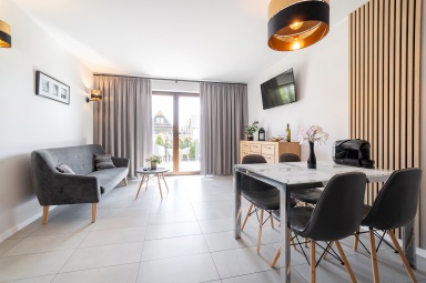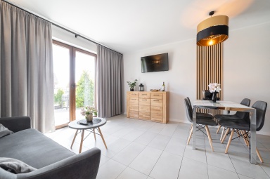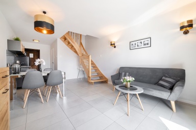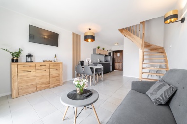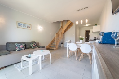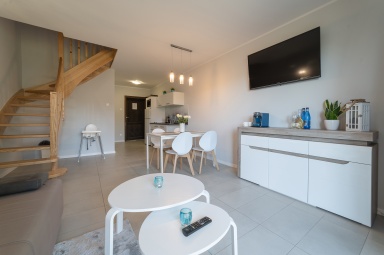 - pokoju dziennego na parterze z dużym stołem jadalnianym, aneksem kuchennym (w pełni wyposażonym) i z łazienki.